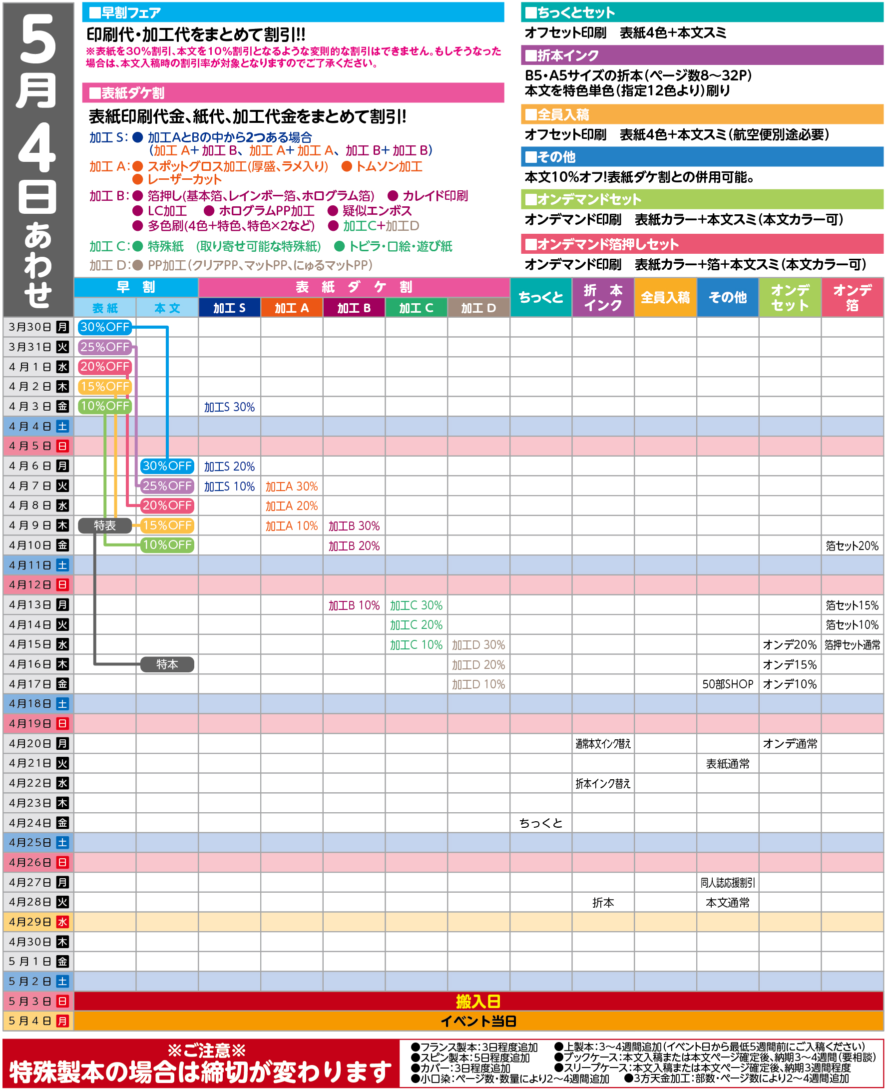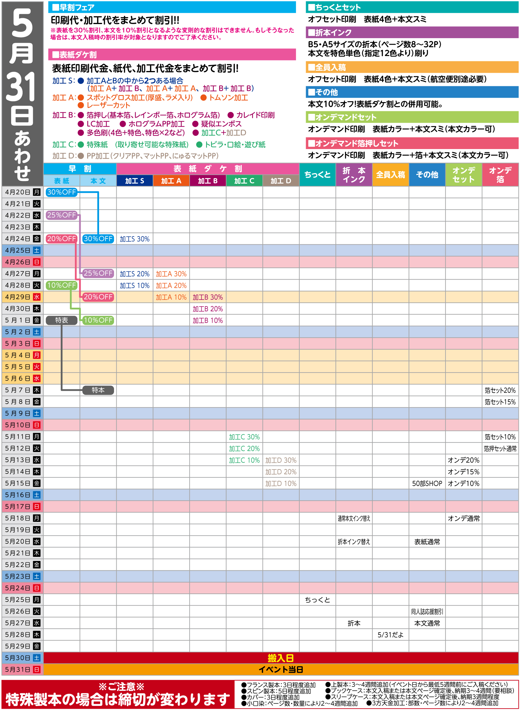 通常イベントの場合、イベント前々日金曜日、前日の土曜日での入稿の際には別途航空便代が発生します。(※ビックイベント時には航空便代発生の〆切が変わりますのでご注意ください)